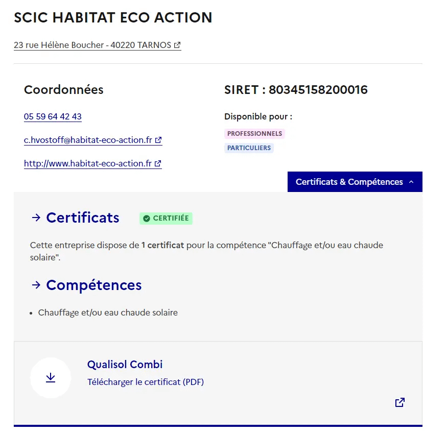 Ici la coopérative SCIC Habitat Eco Action de Tarnos dont fait partie Etxea Confort est bien répertoriée dans l’annuaire de France Rénov‘. Nous avons pris l’exemple d’une installation de chauffe-eau solaire, mais cela aurait pu aussi concerner une chaudière biomasse ou encore l’installation d’un poêle à bûches.